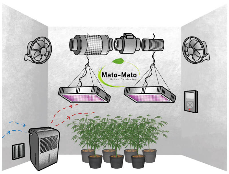 Temperatur, Luftfeuchtigkeit und die Ableitung von Wärme sind entscheidend beim Cannabisanbau. Lampen erzeugen Wärme, die durch Cannabis-Belüftung abgeführt wird. Zu hohe Temperaturen beeinflussen wichtige Parameter negativ: Warme Luft senkt die Luftfeuchtigkeit, extreme Hitze kann Pflanzen austrocknen, ihr Wachstum hemmen und ätherische Öle verdampfen lassen, was der Ernte einen Heugeschmack verleihen kann – dies kann schon ab 28 Grad geschehen.
