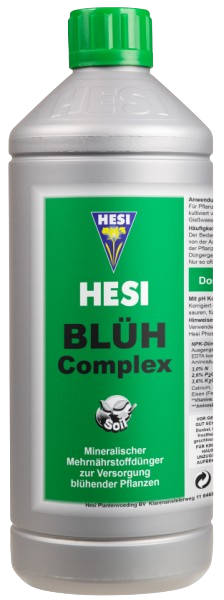 Blüh Complex ist ein NPK-Volldünger mit allen Makro- und Mikronährstoffen und zusätzlichen wertvollen Zusatzstoffen. Blüh Complex sorgt dafür, dass Pflanzen während der Blütezeit voll ertragreich sind. Blüten dienen der Fortpflanzung der Pflanze. Der Übergang vom Wachstum zur Blüte erfordert eine komplette Umstellung des Stoffwechsels. Der eingebaute pH-Korrektor sorgt für optimale pH-Werte und schont so die Pflanzen. Perfekt für Pflanzen im Haus, im Garten oder auf der Terrasse. Ideal für den Dauereinsatz, auch in kleineren Töpfen. Hesi Blüh Complex sorgt für ein optimales Wurzelmilieu und einen lebendigen Boden mit reichhaltiger Mikroflora.