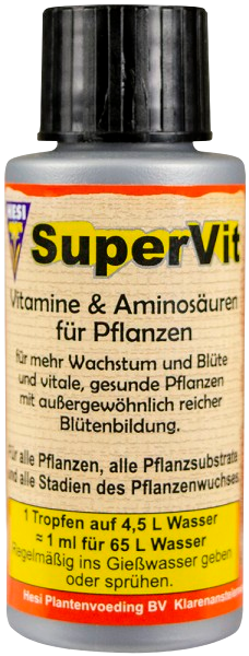 SuperVit ist ein Biostimulans für Pflanzen, das mit nur wenigen Tropfen außergewöhnliche Dinge bewirken kann. Es grenzt an Magie, wie es das Energieniveau der Pflanzen verbessern kann, die Vitalität vergößert und Widerstand gegen hemmende Faktoren verstärkt. SuperVit verbessert die Aufnahme und Verarbeitung von Nährstoffen aus dem Boden und versorgt die Pflanze mit wichtigen Komponenten für den Stoffwechsel. Die vorgefertigten Bausteine in SuperVit ermöglichen es der Pflanze, bestimmte Schritte des internen Stoffwechsels zu überspringen. Das spart Zeit und Energie. Die eingesparte Energie und Zeit kann für eine bessere Entwicklung genutzt werden. Die Vitalstoffe sind auch Wachstumsförderer für die Mikroorganismen im Substrat. So entstehen starke Netzwerke zwischen der Pflanze, dem Substrat und den Mikroorganismen darin.